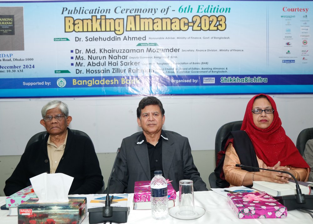 Banking Almanac: 2023 (Sixth Editon)--- A research project of the ShikkhaBichitra. The project is being supported by Bangladesh Bank & other Banks and Financial Institutions, published by Abdar Rahman, Editor: The Weekly ShikkhaBichitra, Project Director : Banking Almanac, House Number 196/3, Shantibag (2nd Floor), Dhaka-1217, Cell: 01715-839515, E-mail: ardssb@gmail.com, bankingalmanac@gmail.com website: www.bankingalmanac.com. Published in December 2024. Total pages 604, ISBN: 978-984-36-0736-2. Price: BDT 1250.00, USD: 100